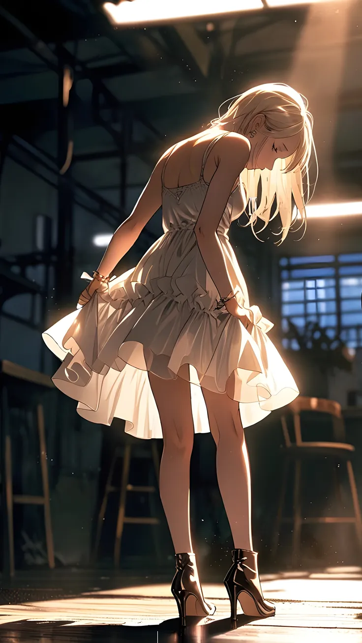 anime blonde girl, anime white frilly dress, anime standing pose, anime back view, anime flowing blonde hair, anime studio background, anime heavy golden lighting, anime black high heels, anime...