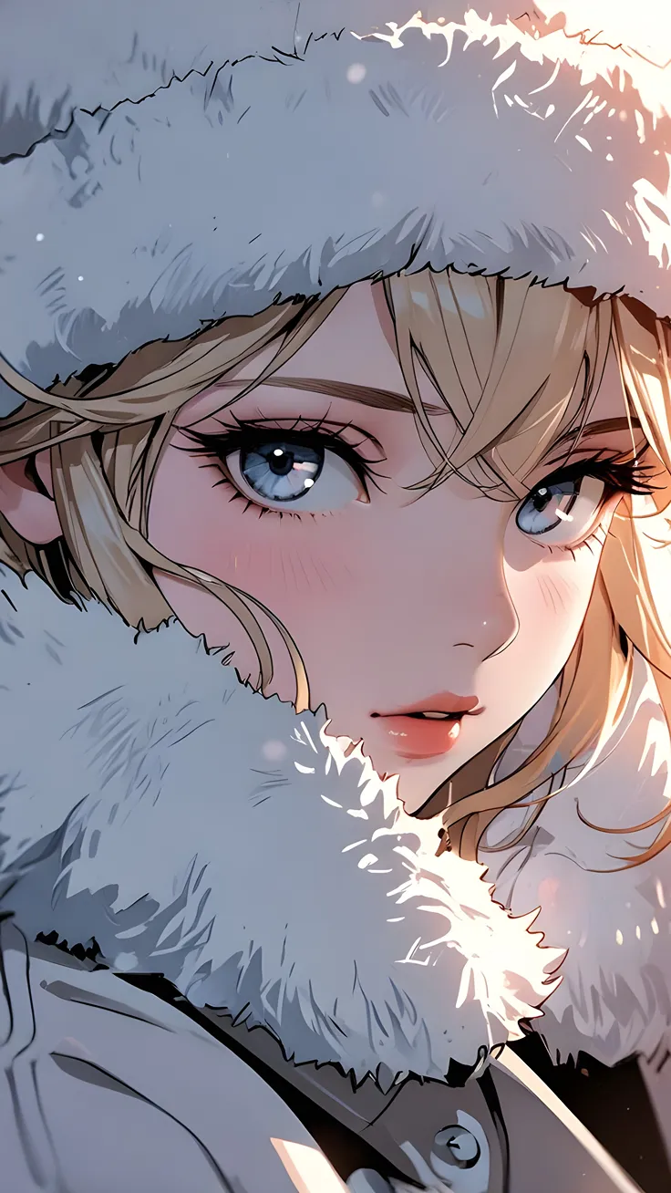anime b ,anime blonde hair ,anime soft blue eyes ,anime warm hate ,anime subtle blushing cheeks ,anime silver pearl earring ,anime gentle warm smile ,anime cozy indoor lighting ,anime sun on face...