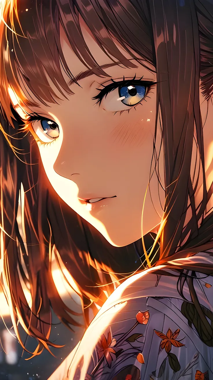 anime close up face, anime long brown hair, anime bright blue eyes, anime cinematic lighting, anime floral print shirt, anime soft blush, anime parted lips, anime sun rays, anime detailed eyelashes,...