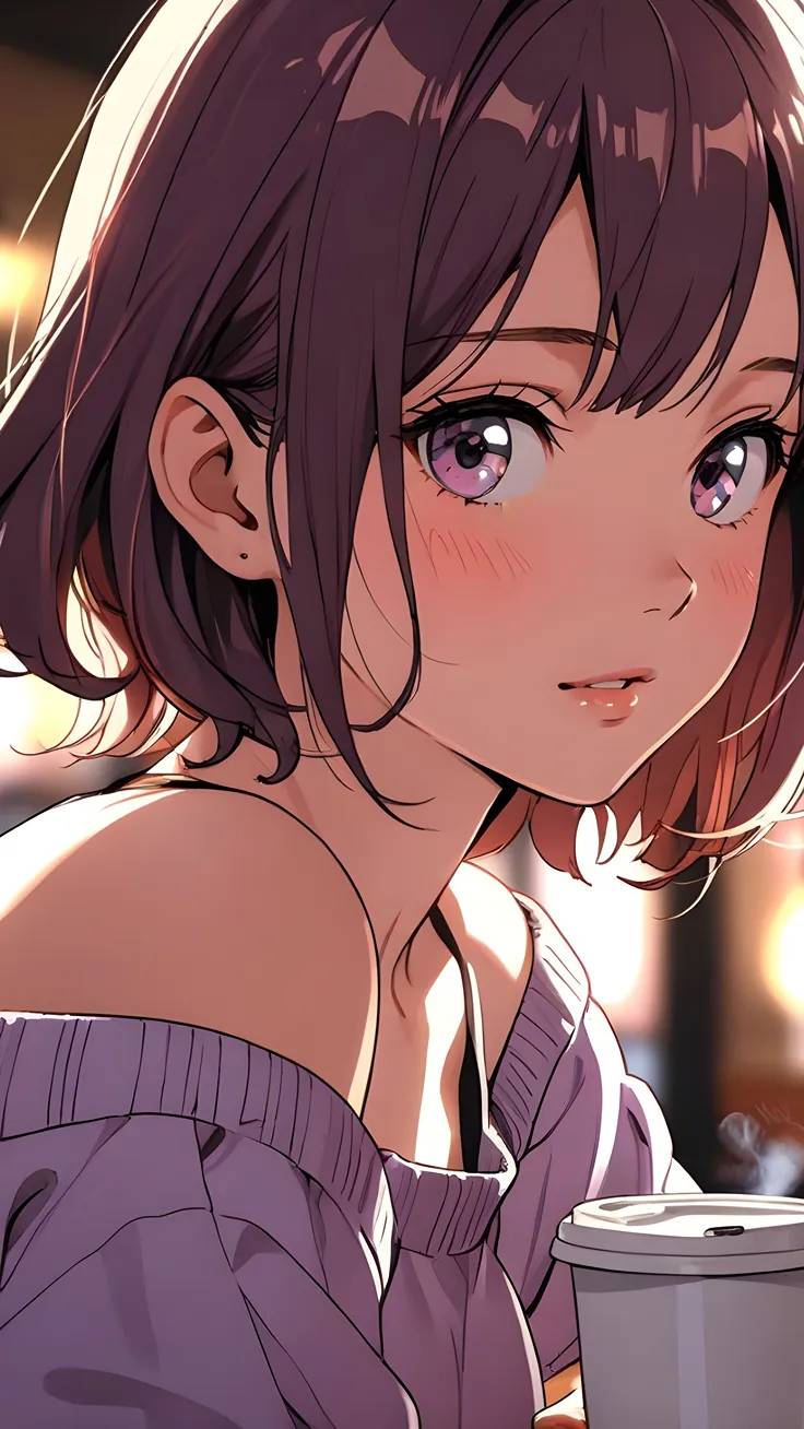 anime girl resting chin on hand ,anime plum-colored short hair ,anime soft purple eyes ,anime mauve off-the-shoulder top ,anime subtle blushing cheeks ,anime silver pearl earring ,anime gentle warm...