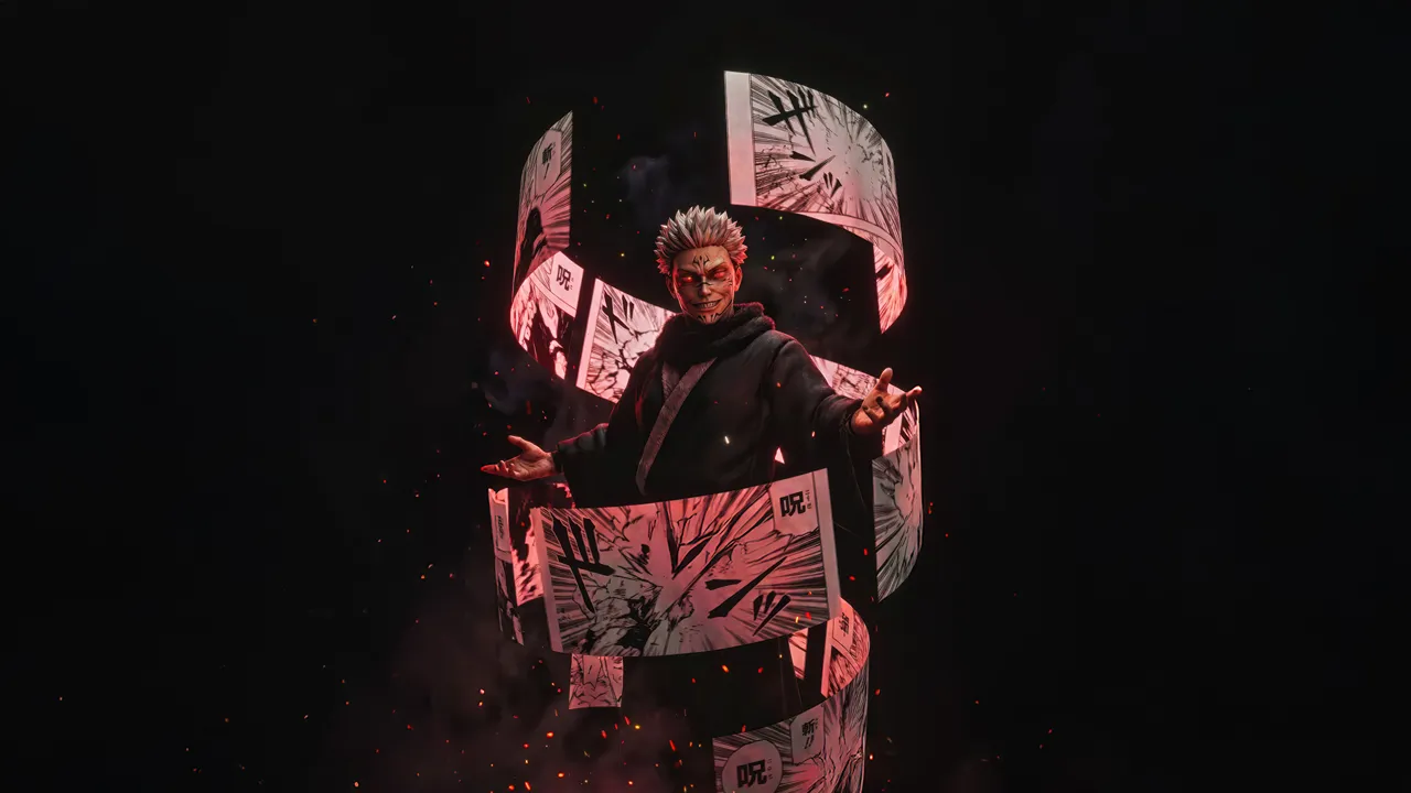 High-quality 4K anime wallpaper featuring a powerful dark sorcerer surrounded by glowing manga panels and red cursed aura. Perfect for anime lovers who enjoy dark fantasy, villain aesthetics, and...