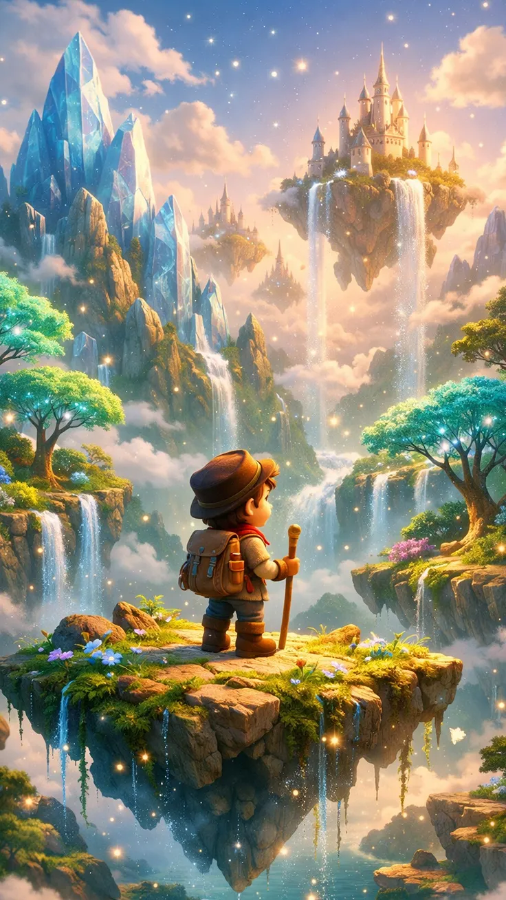 A dreamy 3D fantasy world illustration featuring a cute young explorer standing on a floating island, gazing at a magical sky kingdom with crystal mountains, waterfalls, glowing lights, and enchanted...