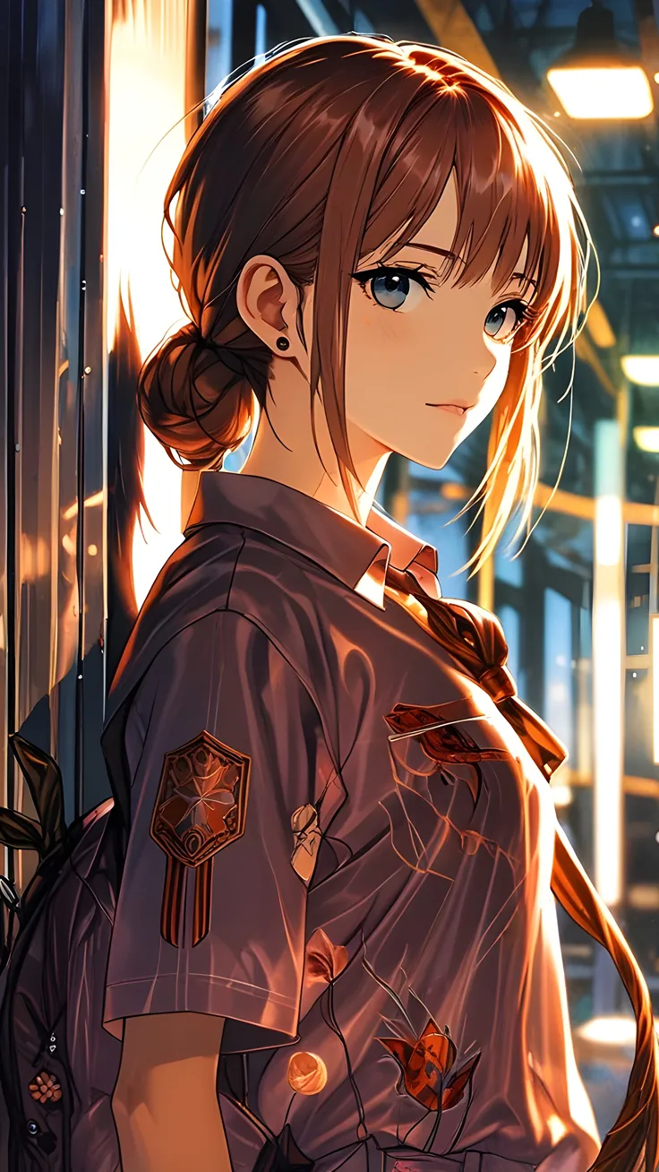 anime brown hair bun, anime school uniform shirt, anime blue eyes, anime orange necktie, anime school backpack, anime golden hour lighting, anime side profile, anime urban background, anime soft lens...