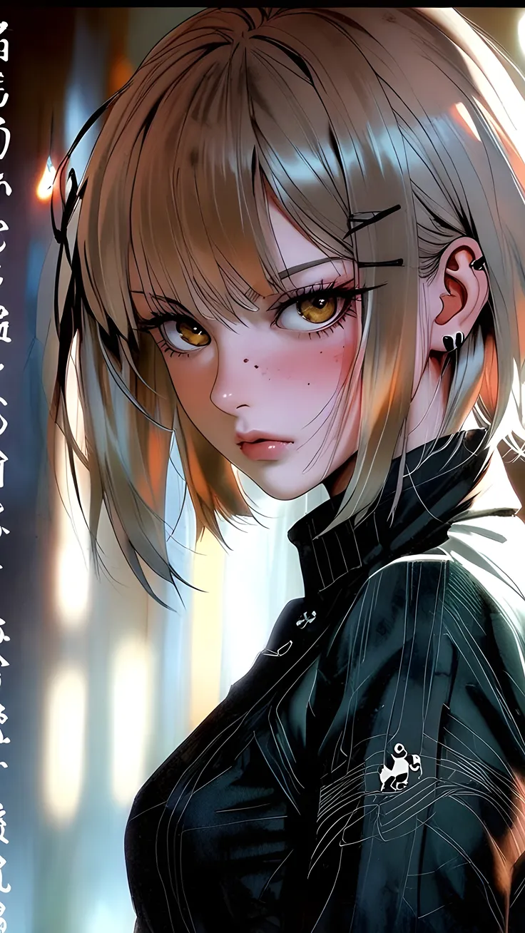 anime close-up portrait, anime sharp amber eyes, anime brown hair, anime heavy blush, anime black choker, anime direct eye contact, anime facial freckles, anime detailed pupils, anime nose highlight,...