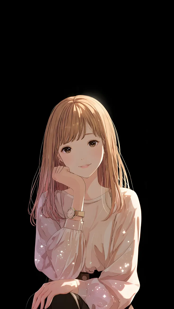 A dreamy anime girl with warm brown eyes and soft golden hair, glowing gently against a deep black background. Her subtle smile and delicate sparkles create a peaceful, magical vibe — perfect for...