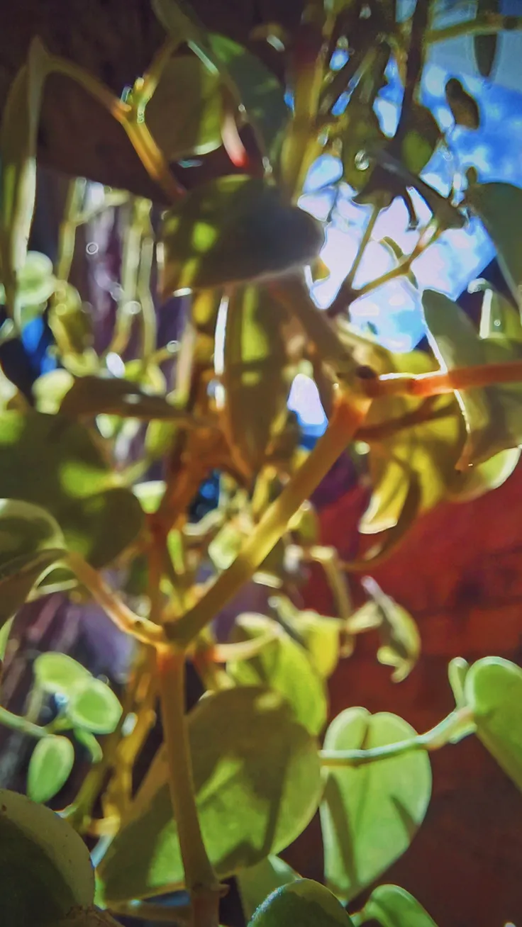 An artistic low-angle shot showing sunlight filtering through the vibrant green and yellow leaves of a climbing plant. The bright light creates a dreamy, ethereal glow and soft shadows, highlighting...