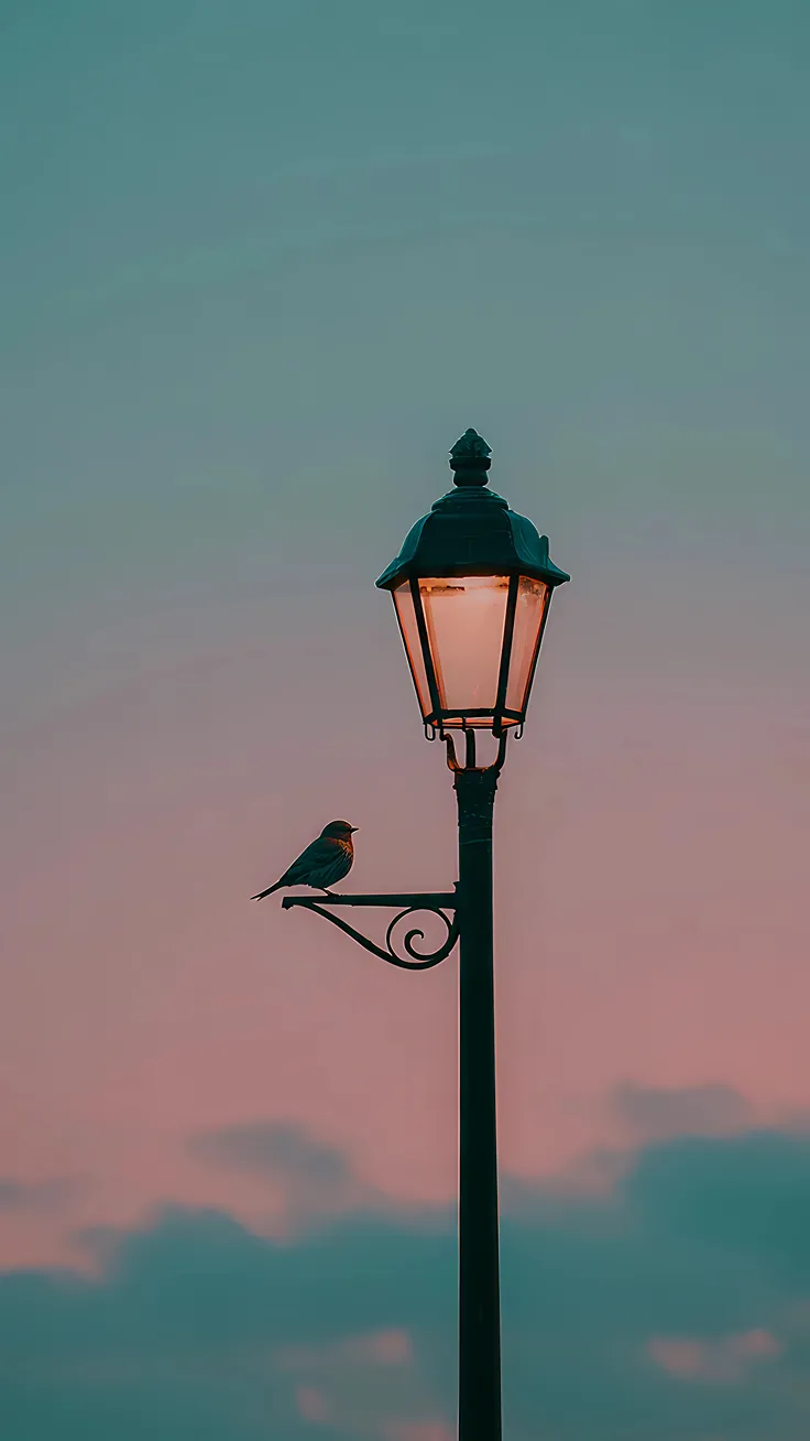 A quiet balcony scene with a glowing evening lamp and a lone bird resting against the fading sky. This artwork reflects calm energy, solitude, and the gentle beauty of twilight.