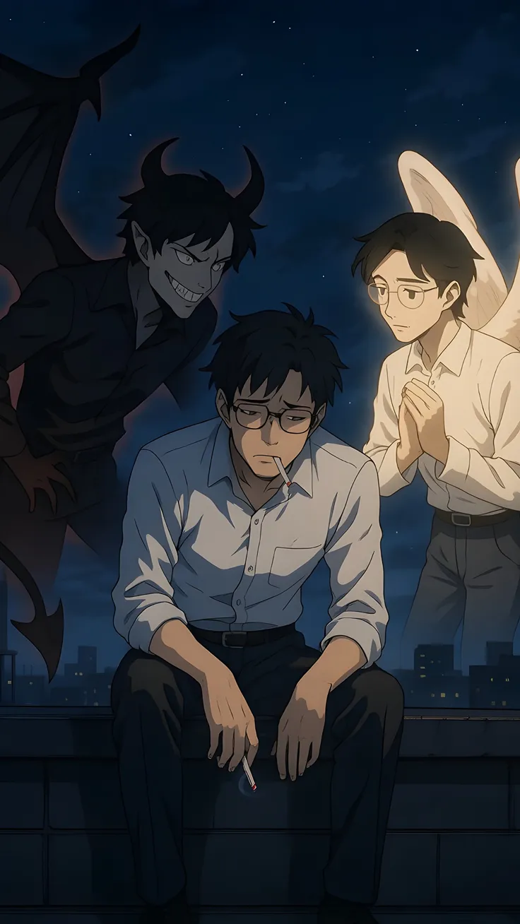 A man on the house rooftop ,at night,no hope. Angel and demon on his shoulder saying to usmore...