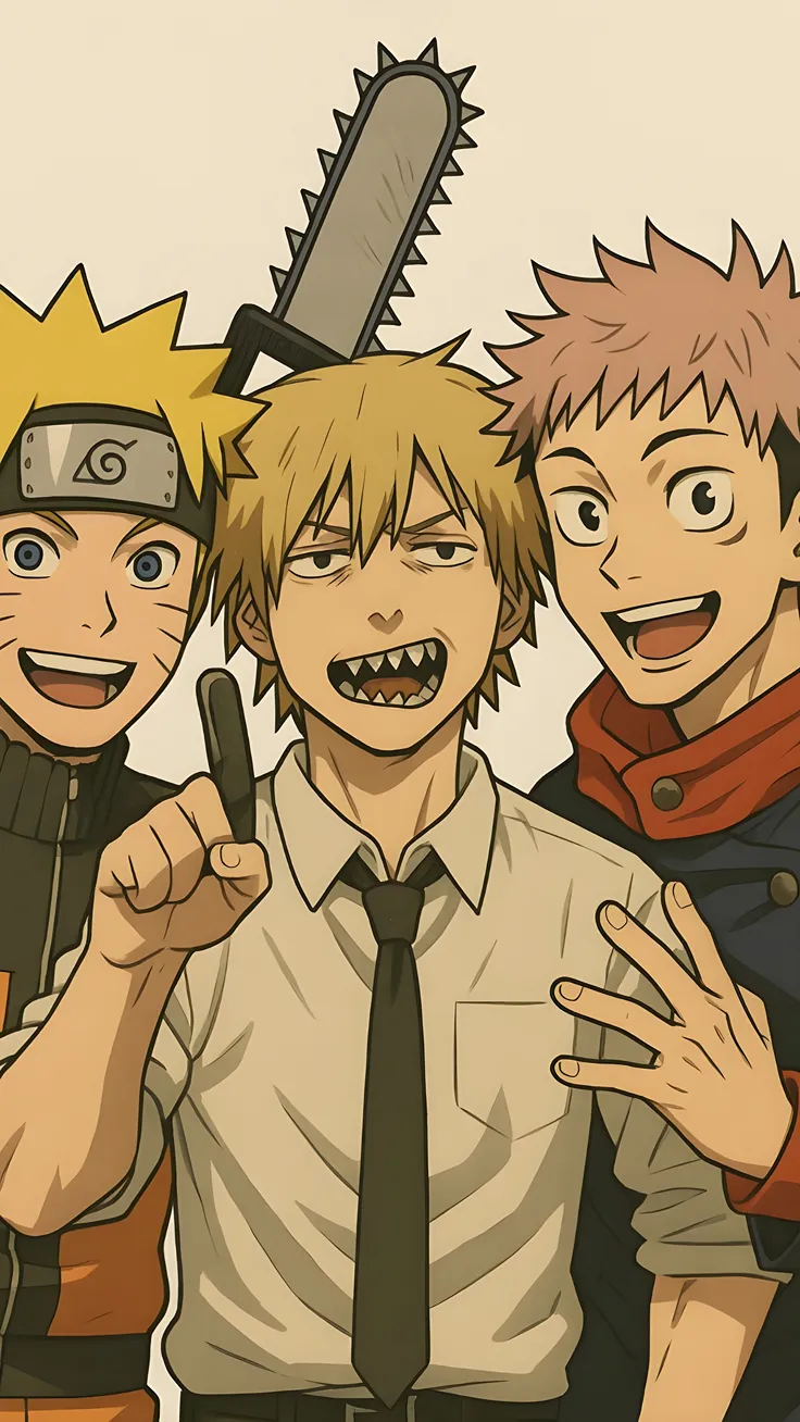 Anime fan art of naruto (naruto) ,denji (chainsaw man) and yuji (jujutsu keisen) trio
