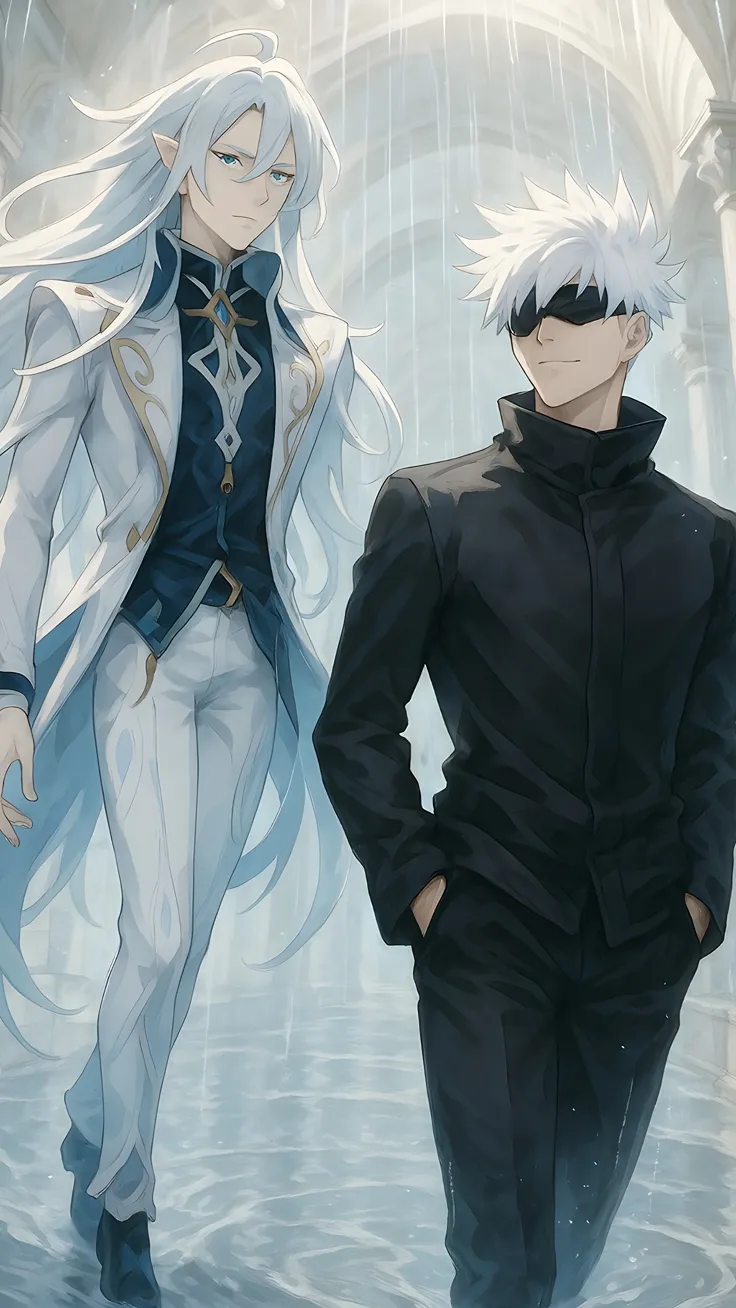 Anime fan art of neuvilette (genshin) and Gojo Satoru (Jujutsu Kaisen) duo