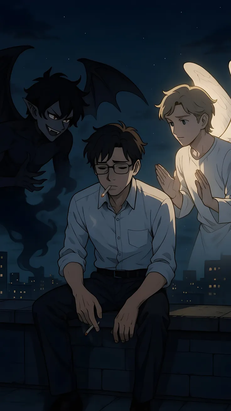 A man on the house rooftop ,at night,no hope. Angel and demon on his shoulder saying to us more...