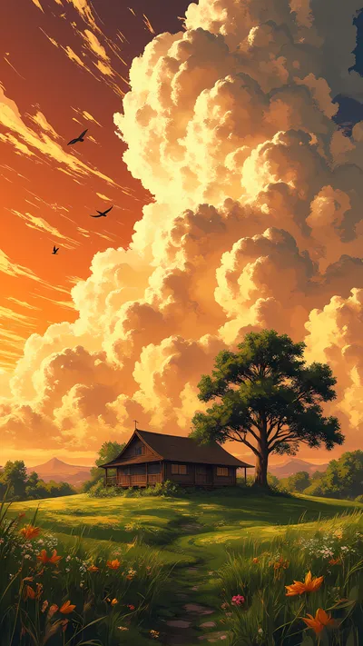 A cottage cradled in stillness, where twilight sings in reflections and every cloud carries a secret from the sun