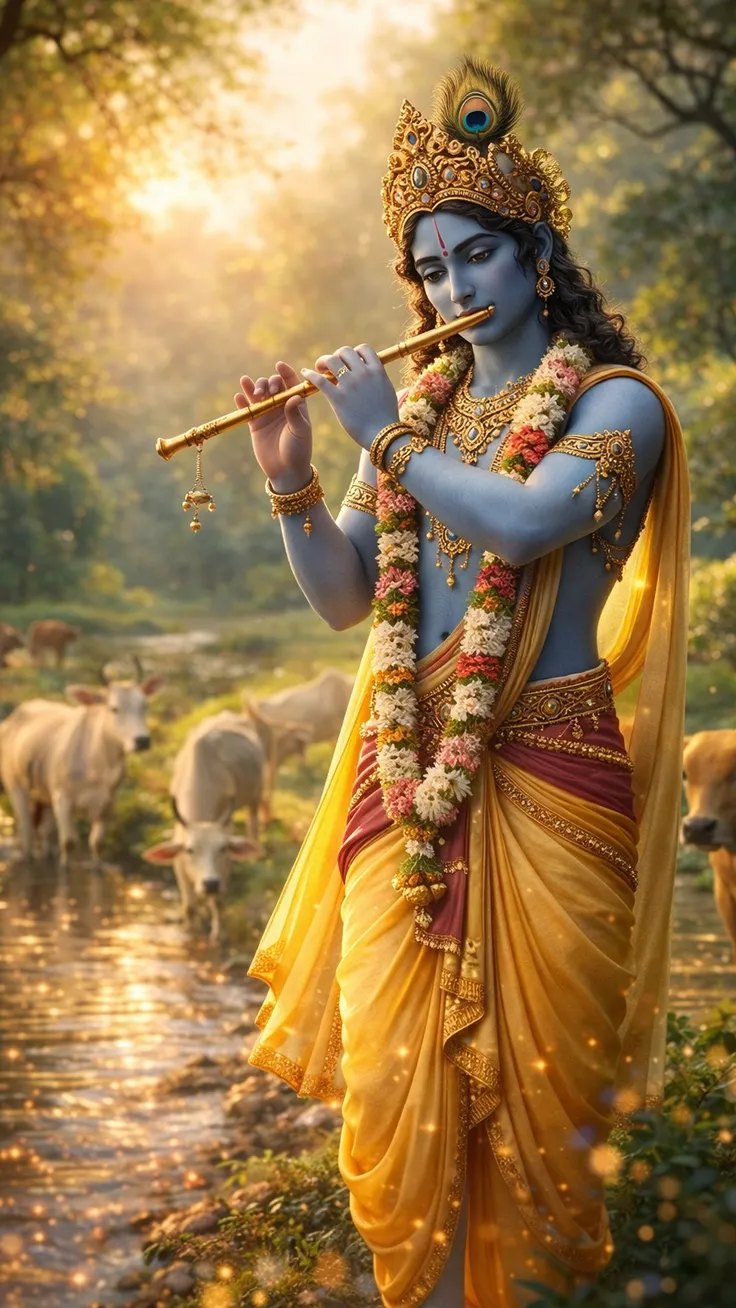 Divine Krishna in Vrindavan Peaceful Devotional 3D Art with Flute & Cows
