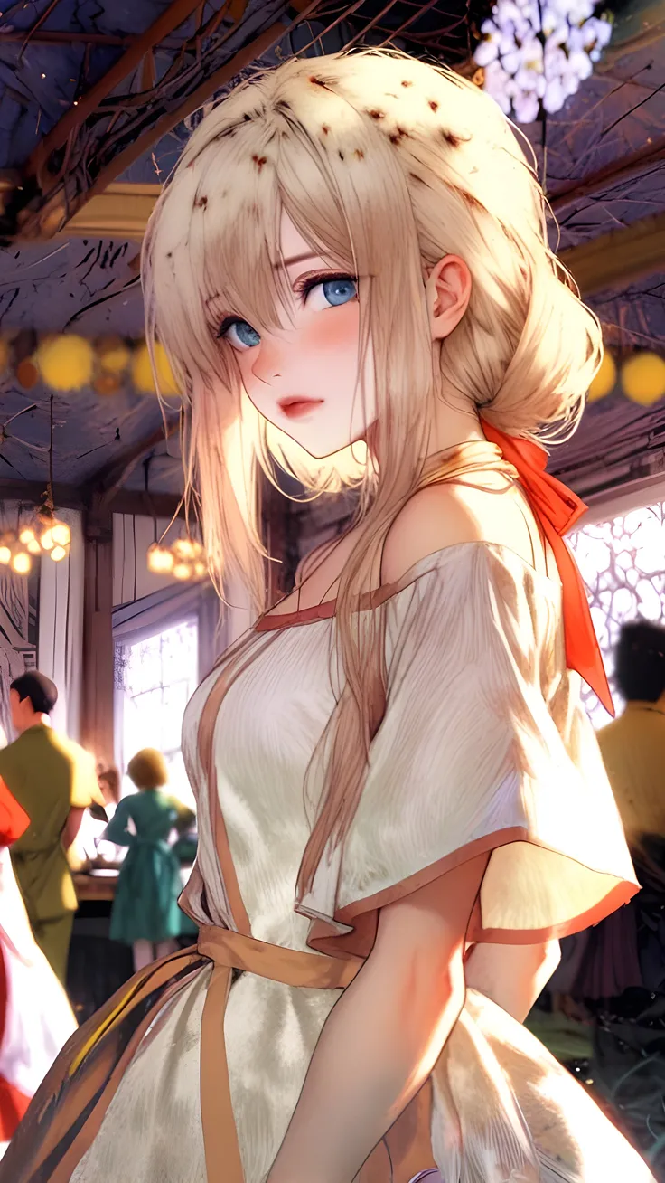 Anime girl wearing a beautiful dress in coffee AI