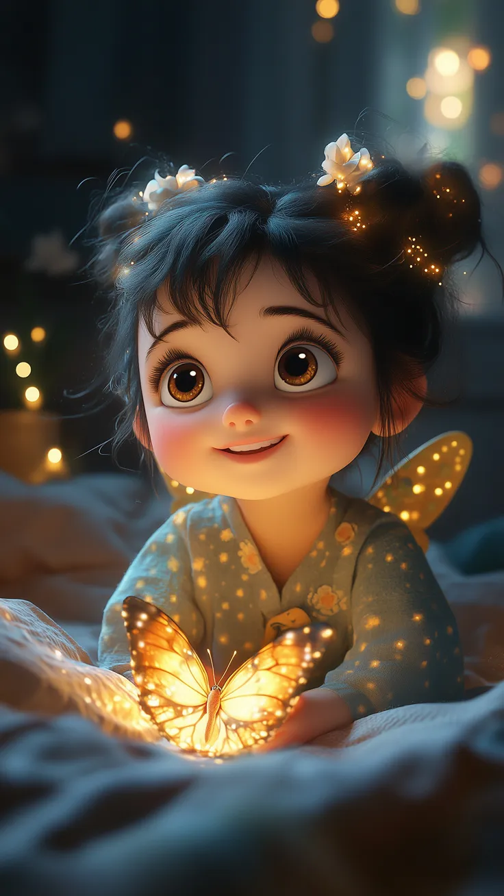 A sweet fairy girl with big sparkling brown eyes and dark hair in cute twin buns adorned with glowing flowers. She wears soft floral pajamas and delicate golden wings, cradling a radiant glowing...