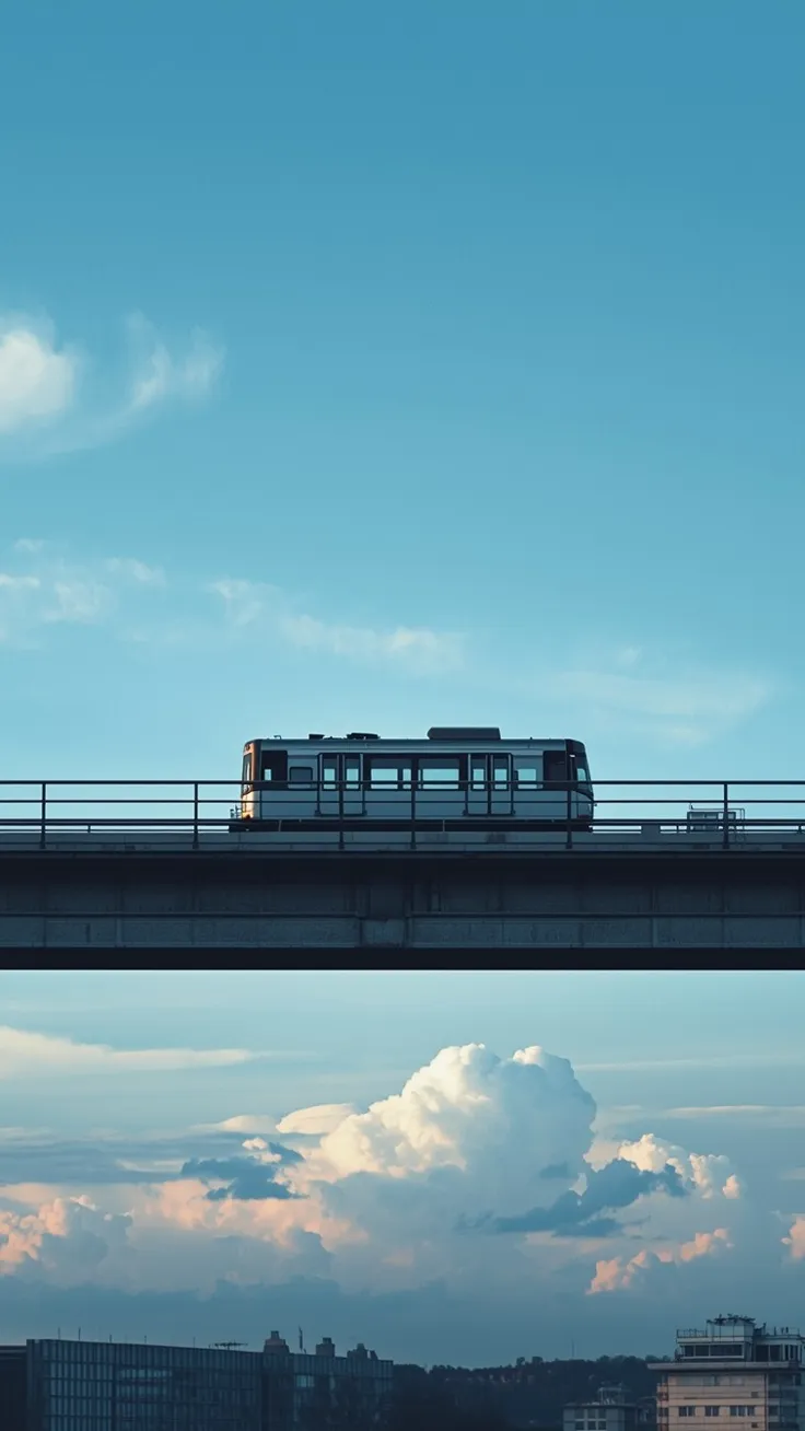 Silent Urban Motion captures a single metro train gliding across an elevated bridge beneath an endless blue sky. This minimalist urban artwork focuses on negative space, clean geometry, and peaceful...