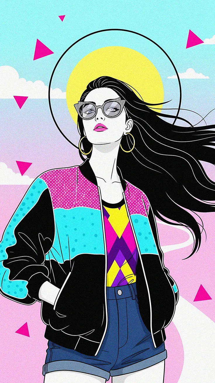 A cool, wind‑swept heroine in bold neon colors, oversized hoops, and a patterned jacket, framed against a dreamy synthwave sky. This piece channels a Patrick Nagel–inspired art style with crisp...