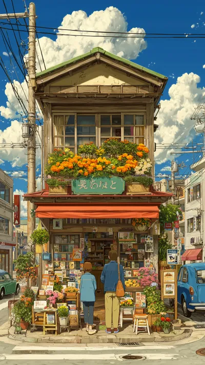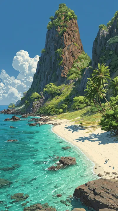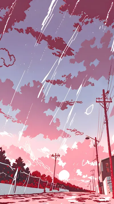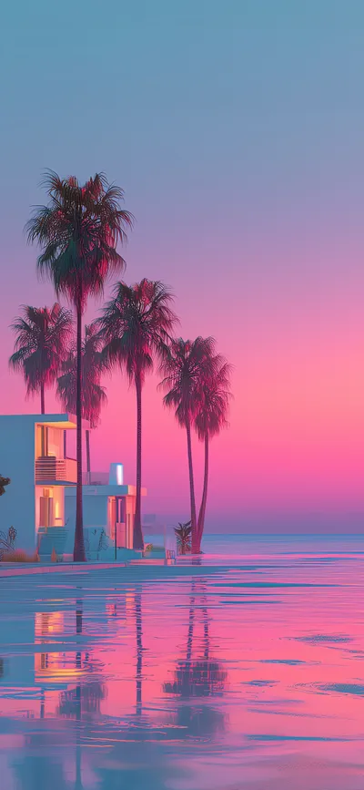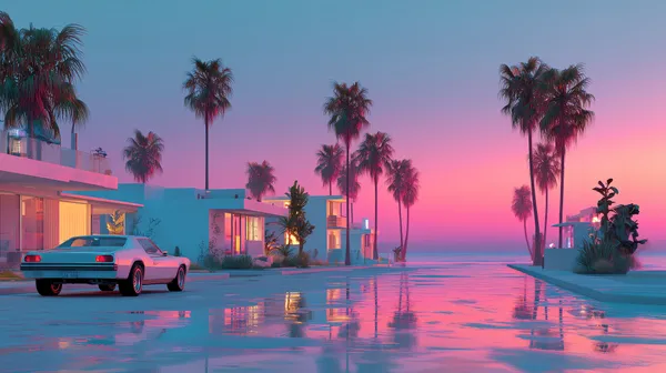 In the afterglow of the sunset, a retro white sports car stopped next to the seaside villa. The pink and purple sunset glowed on the wet street, and the silhouettes of tall palm trees swayed in the...