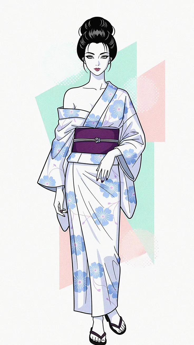 A graceful woman in a pale floral yukata poses against soft pastel shapes, her dark hair swept into a glossy bun. This illustration blends a Patrick Nagel inspired art style with anime influences,...