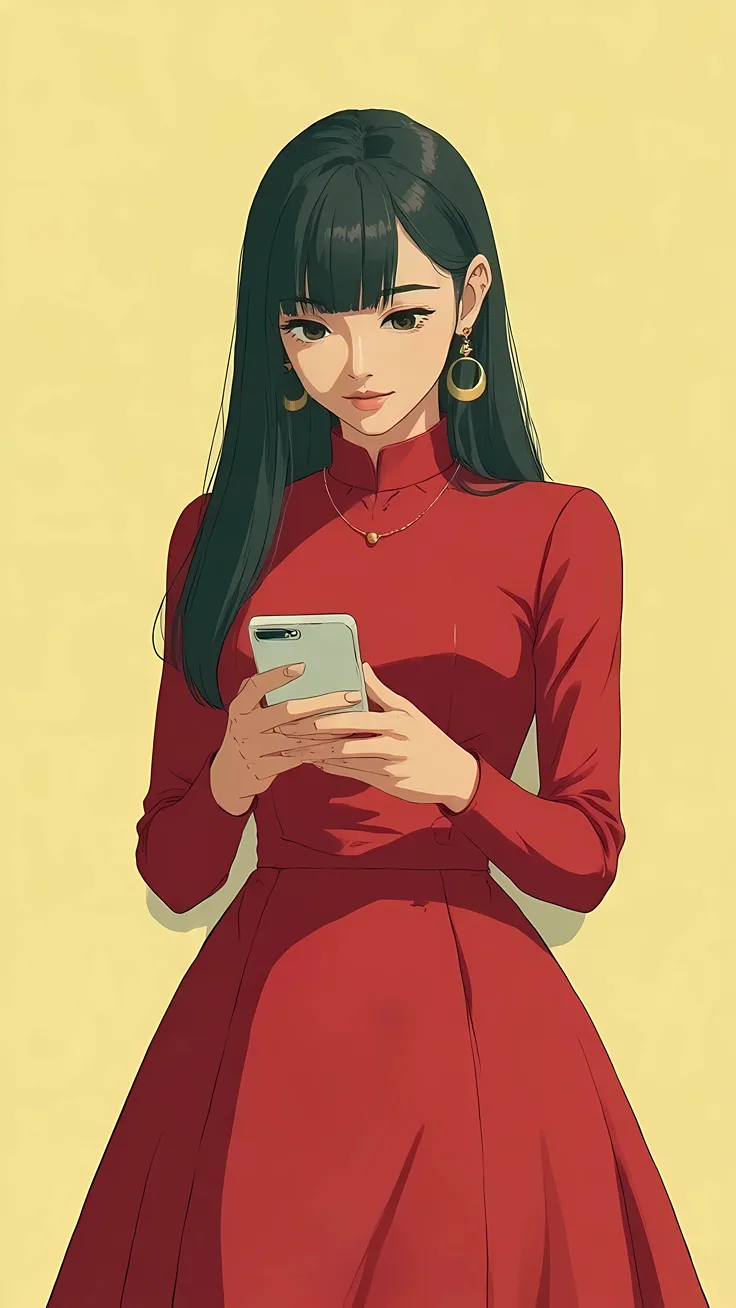 A modern cinematic portrait featuring a graceful woman in warm tones, focused on her phone. The artwork reflects calm confidence, elegance, and a soft aesthetic suitable for wallpapers and digital...