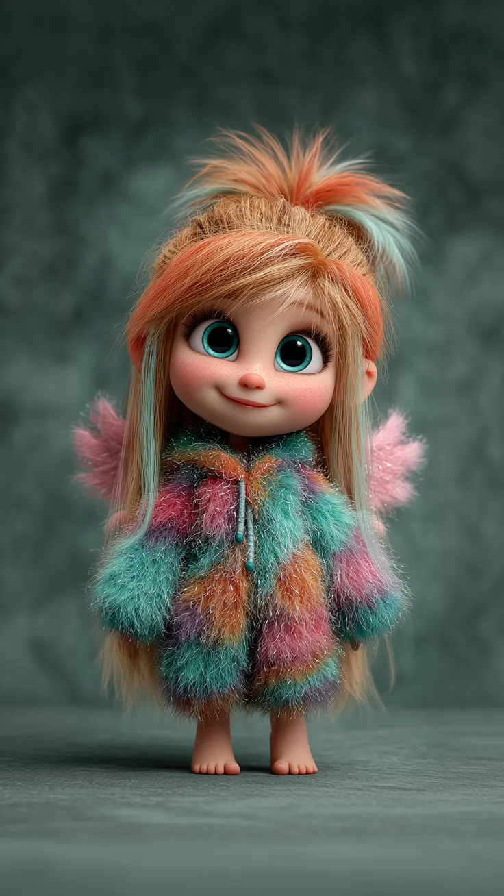 A cute little fairy girl with long multicolored hair in vibrant orange, teal, and pink streaks, large sparkling blue eyes, and freckled cheeks. She stands barefoot in a fluffy rainbow-striped fuzzy...