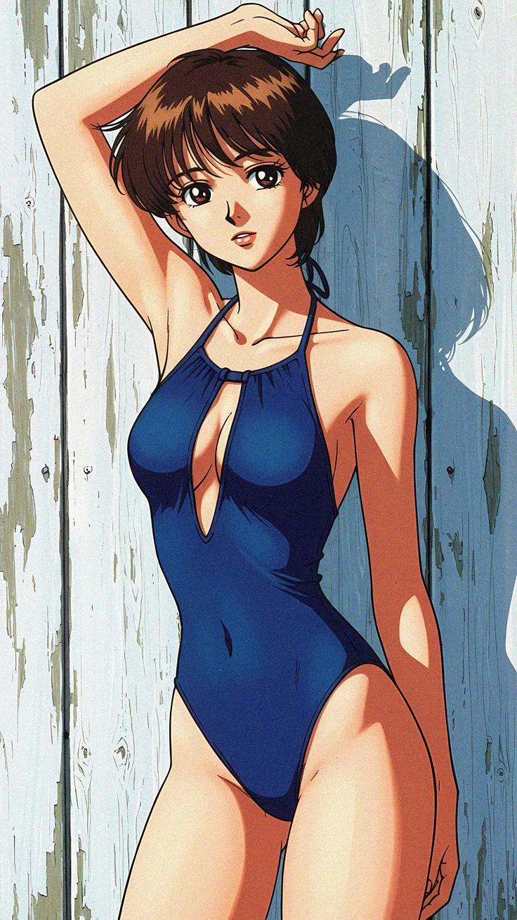 Presenting a stunning collection of retro anime-inspired digital illustrations: each piece features a stylish girl in a classic blue halter swimsuit, evoking vintage 80s-90s Japanese animation charm....