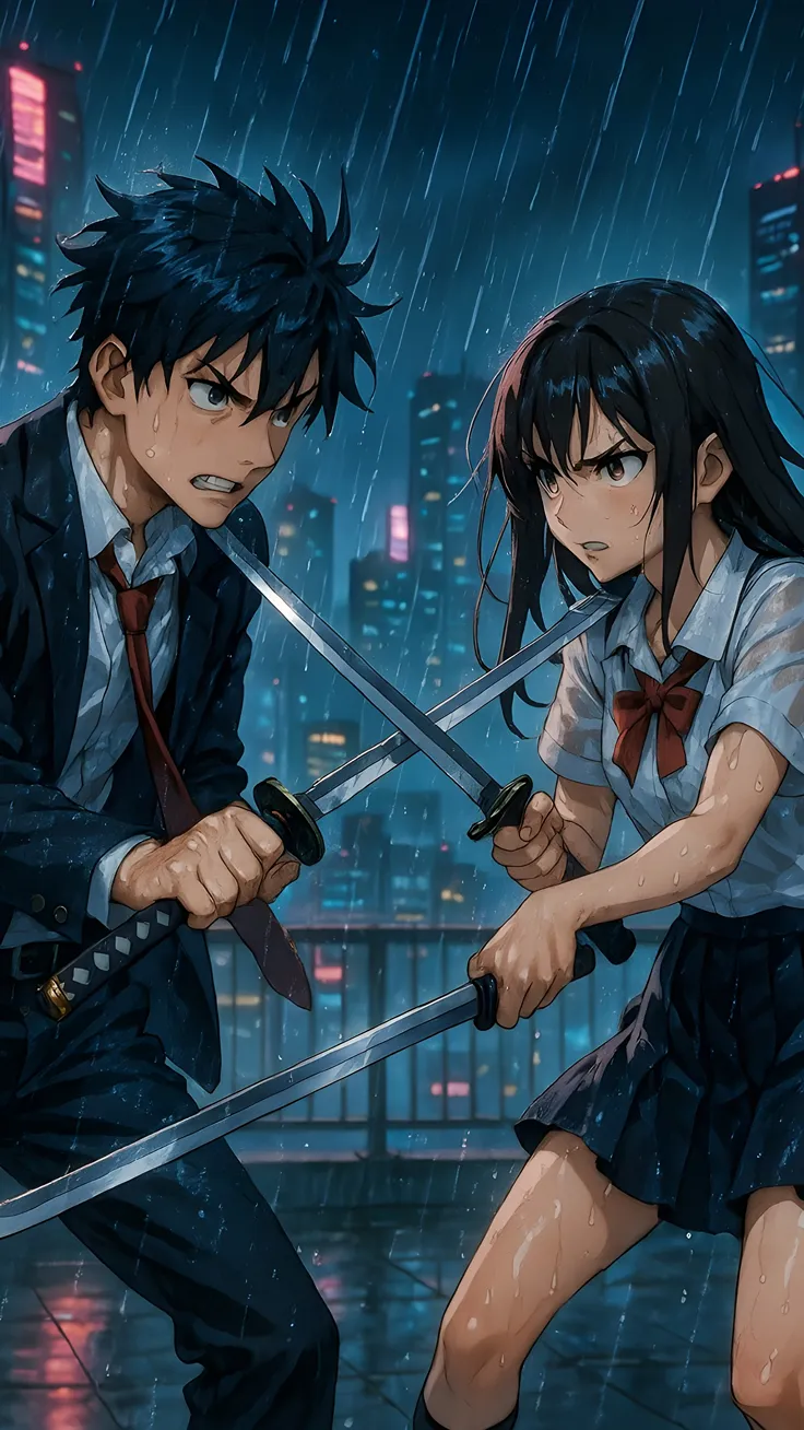Two students one girl and one boy fighting with Swords on the roof in rain