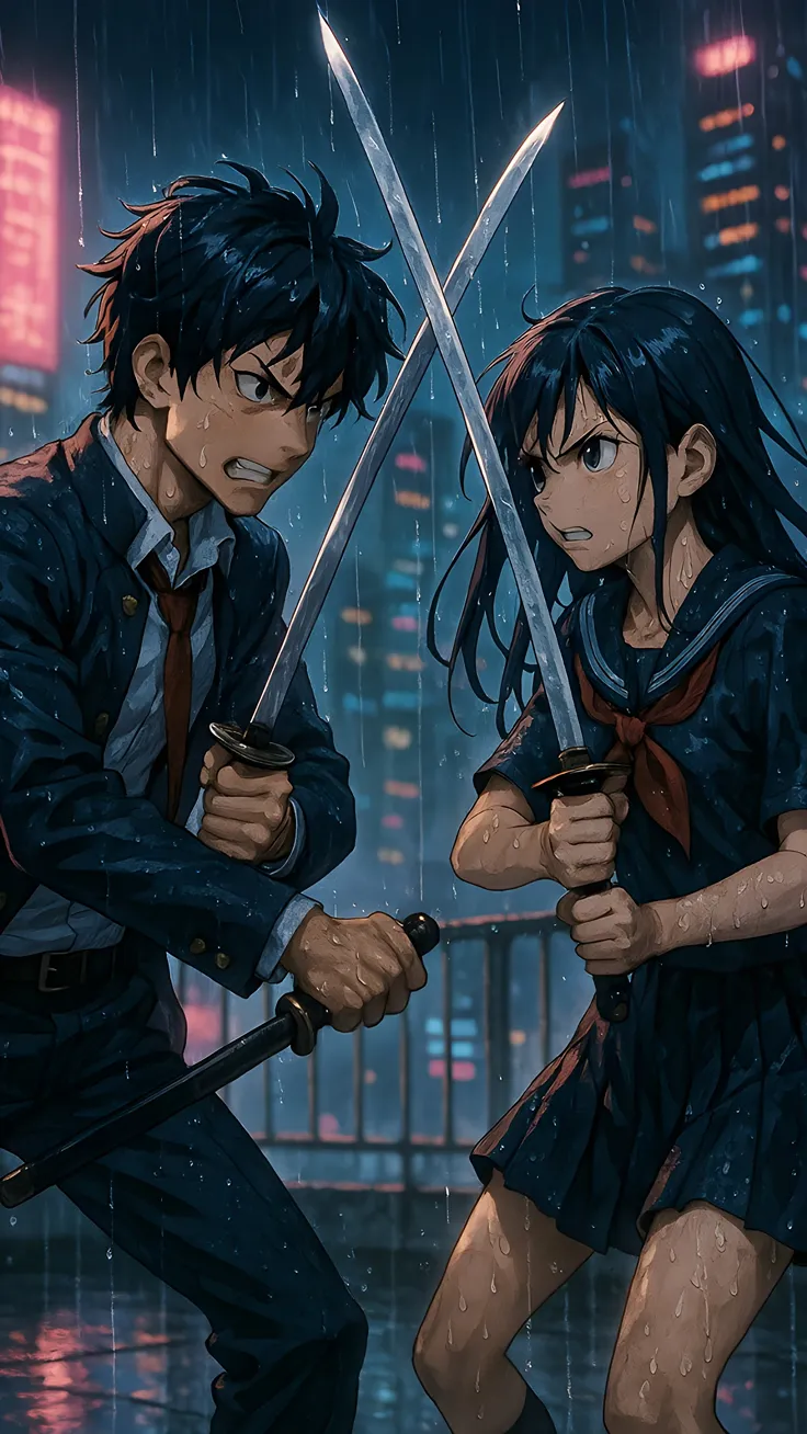 Two students one girl and one boy fighting with Swords on the roof in rain